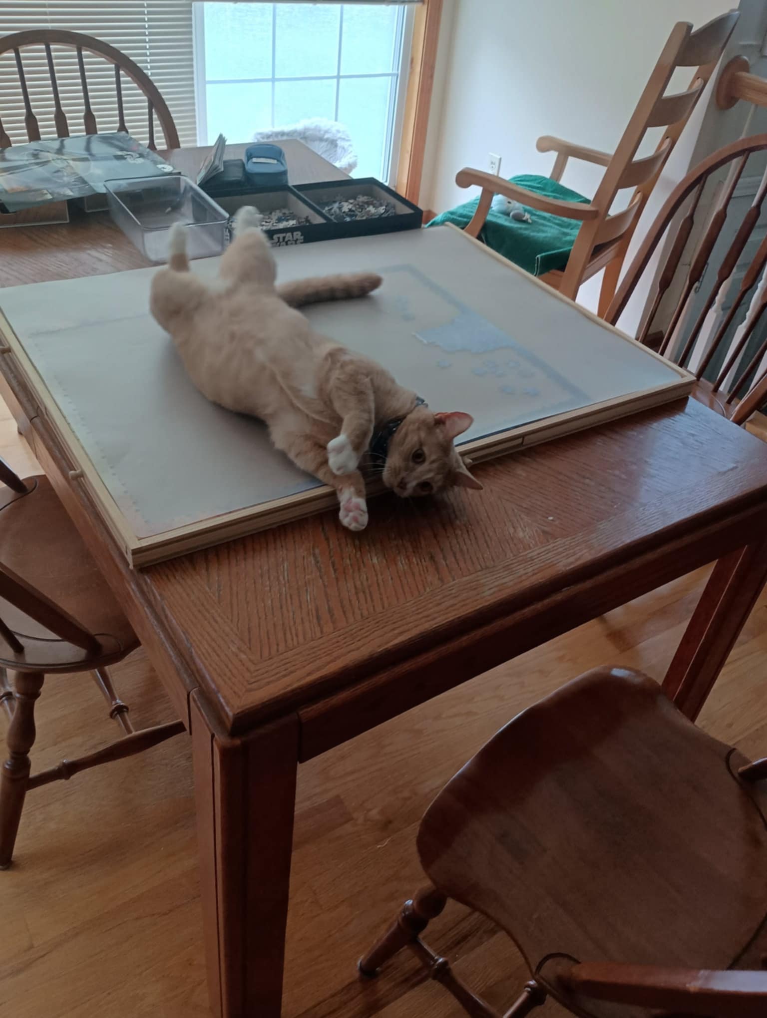Right: Boise disrupting the completion of a jigsaw puzzle on vacation at my parents’ house.